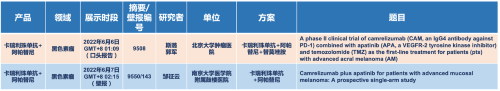 在黑色素瘤领域,九游会医药的卡瑞利珠单抗联合阿帕替尼(“双艾”组合)在2022 ASCO共入选1项口头报告和1项壁报展示。