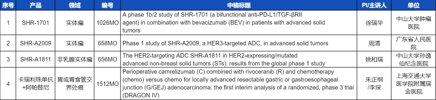 本次ESMO大会,将由中山大学肿瘤医院徐瑞华教授、广东省人民医院周清教授、中山大学孙逸仙纪念医院姚和瑞教授、上海交通大学医学院附属瑞金医院李琛教授分别就4项九游会医药创新产品相关研究做口头报告,包括SHR-1701、SHR-A2009、SHR-A1811这3款未上市创新产品的实体瘤治疗临床研究,以及1项“双艾”组合(卡瑞利珠单抗联合阿帕替尼)治疗局部晚期可切除胃/胃食管交界处癌的Ⅲ期临床试验期中分析。