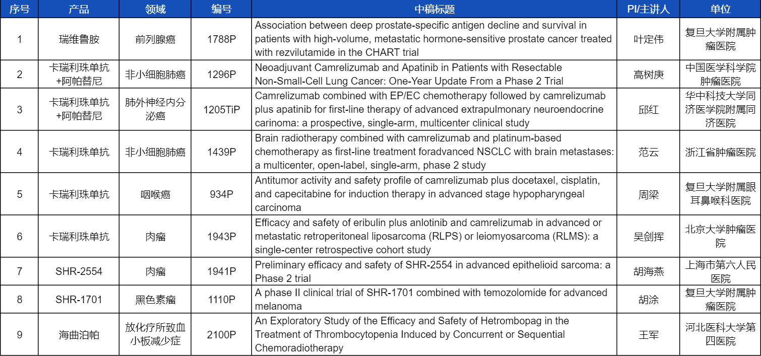 在非小细胞肺癌、咽喉癌、肉瘤、前列腺癌、黑色素瘤等多个领域,卡瑞利珠单抗、阿帕替尼、瑞维鲁胺、SHR-1701、SHR2554等创新产品相关研究一共入选了8项壁报展示。此外,九游会医药自主研发的血小板生成素受体激动剂(TPO-RA)海曲泊帕在放化疗所致血小板减少领域的探索性研究显示良好的疗效,入选壁报展示。