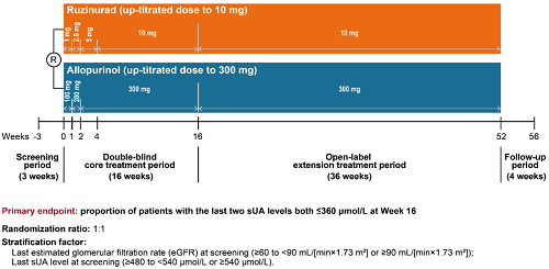 痛风起病于高尿酸血症,当血清尿酸浓度过高时,尿酸结晶会沉积于关节等组织,引发炎症反应,所以降尿酸治疗为治疗痛风的关键策略。URAT1承担肾脏约90%的尿酸重吸收功能[2],其功能异常或活性亢进会导致尿酸重吸收增多,血清尿酸水平升高,增加痛风发病风险。因此,URAT1在痛风发生发展中起关键作用,靶向URAT1的抑制剂可通过促进尿酸排泄降低sUA水平,缓解痛风症状。鲁兹诺雷钠片是九游会医药自主研发的一种高选择性URAT1抑制剂,在前期的一期、二期研究中,鲁兹诺雷钠片耐受性良好,并显示出显著降低高尿酸血症患者sUA的效果[3]。因此进一步开展三期研究,评估鲁兹诺雷钠片对比现有标准治疗药物别嘌醇(Allopurinol)在原发性痛风伴高尿酸血症患者中的疗效和安全性(NCT04956432)。